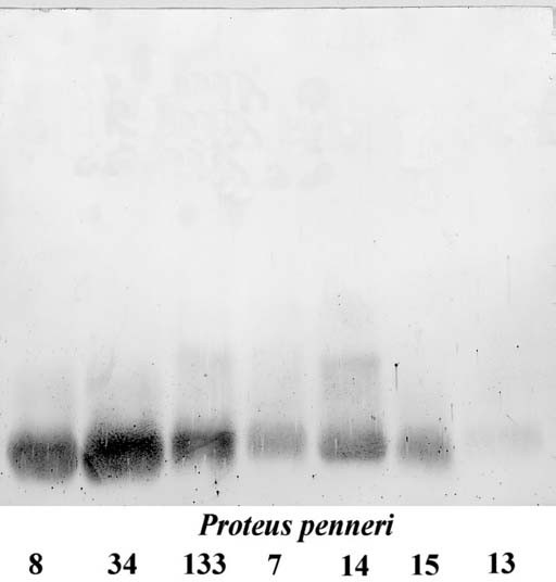 In Western blot, both the anti-conjugate and the anti-core sera bound to low-molecular-mass LPS species consisting of the core-lipid A moieties of P. penneri 8, 34, 133, 7, 14, and 15 LPS samples (Figs. 1, 2). As in ELISA, only the anti-core serum reacted with P. penneri 13 LPS. It showed only a weak banding pattern.