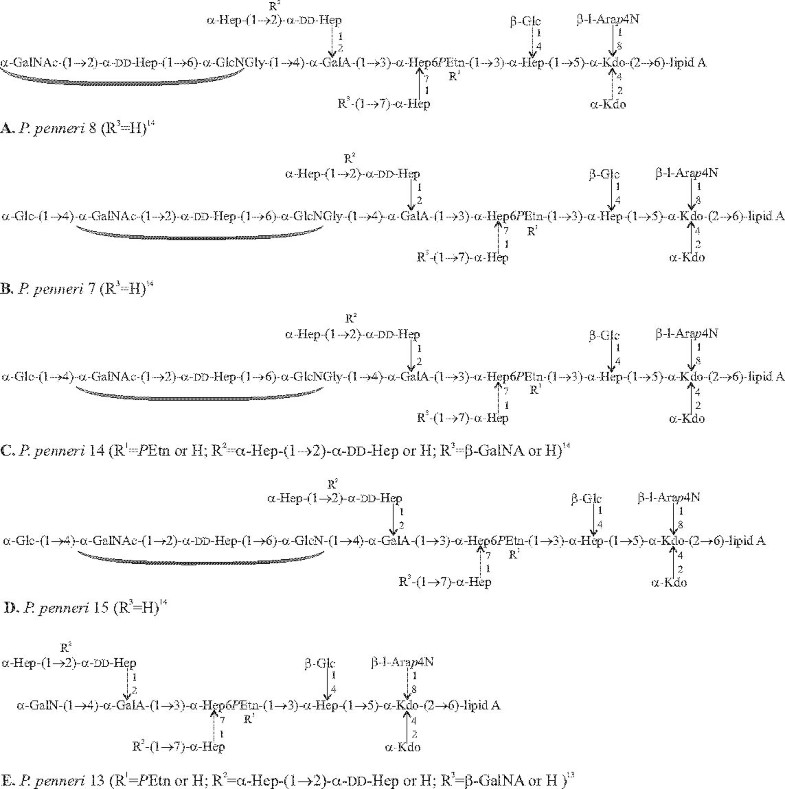 General structures of the core-lipid A region of P. penneri 8 (A), 7 (B), 14 (C), 15 (D), and 13 (E) LPSs. The putative common epitope in the P. penneri 8 (A), 7 (B), 14 (C), and 15 (D) core regions is indicated by an arc. Arap4N — 4-amino-4-deoxy-L-arabinopyranose, GalA — galacturonic acid, GalNA — amides of GalA with aliphatic polyamines, GlcNGly — 2-deoxy-2-glycylamino-d-glucose, Hep — l-glycero-d-manno-heptose, dd-Hep — d-glycero-d-manno-heptose, Kdo — 3-deoxy-d-manno-oct-2-ulosonic acid, PEtn — 2-aminoethyl phosphate.