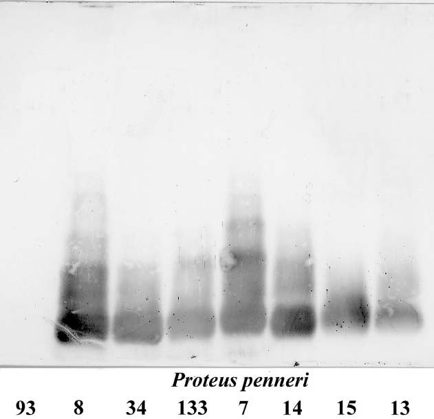 Western blot of P. penneri LPSs with serum against the P. penneri 34 LPS core region.