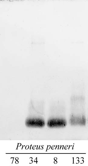 According to the serological data obtained in this study, this antiserum reacted in the same way in ELISA with the LPSs of P. penneri 8, 34, and 133 (antiserum titer 1:8000; data not shown). As expected, in Western blot this antiserum recognized fast-migrating bands (restricted to the core-lipid A molecule) of the three tested antigens. The LPS of P. penneri 78 was used here as a control of O-polysaccharide-specific antibody elimination from the antiserum (Fig. 3).