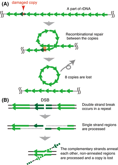 Repair of damage in the rDNA repeats results in the reduction of copy number. a Recombinational repair between the repeats. During G1, DNA damage in one rDNA repeat may be repaired by recombination with another rDNA repeat. rDNA repeats located between the damaged and template copies may be lost by the recombination. b Single-strand annealing (SSA) pathway for repair of repeating genes. When double-strand break (DSB) occurs in a repeat, single-stranded regions are created adjacent to the break and they extend to the complementary strands. Then the strands anneal to each other to repair. In this case, a copy will be lost