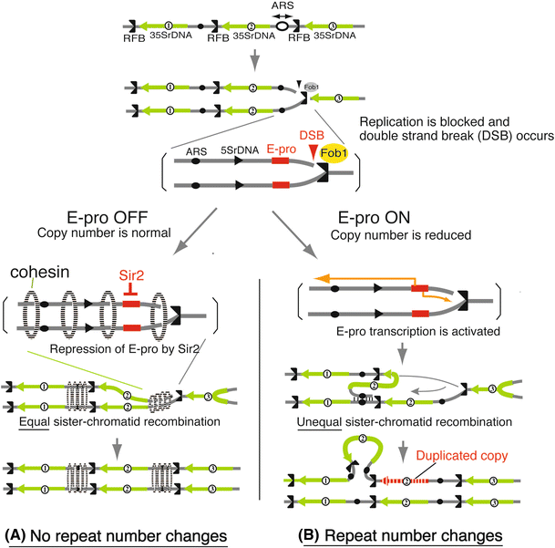 This amplification is regulated by a promoter, E-pro, which directs transcription of a non-protein coding transcript [13]. E-pro is located beside the RFB and starts transcription bi-directionally (Fig. 1) [14, 15]. These transcripts interfere with the function of cohesin, a protein that connects sister chromatids. As a result of the inability of cohesin to link sister chromatids in the presence of E-pro, unequal sister chromatid recombination is increased [13]. When the repeat number is around the wild-type level, E-pro transcription is repressed by Sir2, the NAD+-dependent histone deacetylase. Sir2 alters chromatin structure, and as a result, the amplification does not occur. On the other hand, when rDNA copy number is reduced, Sir2 repression is removed and the amplification is induced [13]. Though it is not known how a cell monitors the rDNA copy number, one possible mechanism is that the auto-regulation of SIR2 gene may be related. If SIR2 itself is regulated by Sir2 protein, when the rDNA copy number reduces, Sir2 proteins that were released from rDNA bind to SIR2 promoter to repress the transcription. As a result, the amount of Sir2 in the cell is reduced and E-pro can start transcription to activate the rDNA amplification system. When the copy number reaches near the wild-type level, Sir2 is spent by the rDNA and the repression of SIR2 gene is reduced. Then the amount of Sir2 increases to repress E-pro and the amplification stops. In fact, in a sir2 mutant, the amplification does not stop, and reaches around 300 copies [11]. Thus, rDNA copy number may be monitored and stably maintained at the proper level (Fig. 3). In addition, not only the number but also the quality of the copies seems to be maintained by the same Fob1-dependent recombination system. It is known that all of the rDNA copies have almost identical sequences [16]. This phenomenon is called “homogenization” [17]. The Fob1-dependent recombination makes it possible to convert (repair) a mutation that occurs in a unit using another unit as an information donor.
