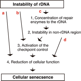 The rDNA theory for aging. The rDNA is one of the most unstable regions in the genome. Therefore, its instability affects cellular functions. rDNA instability a directly reduces cellular functions through dysfunction of ribosomes, b activates the damage checkpoint control that reduces cellular functions through elongation of cell cycle, c sequesters repair enzymes, resulting in the instability of non-rDNA regions and d the instability of non-rDNA regions reduces cellular functions through the checkpoint control and dysfunction of important genes (see [1])