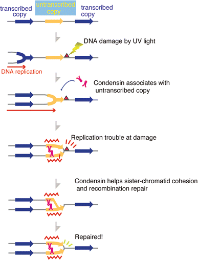 Untranscribed copies repair DNA damage. In the rDNA repeats, about half of the copies are not transcribed. Such untranscribed copies in the rDNA are the “foothold” for condensin, a protein that facilitates DNA repair by mediating sister-chromatid cohesion. The cohesion makes recombinational repair possible (see text for detail)