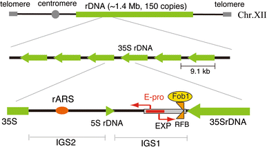 Structure of the budding yeast rDNA locus. The rDNA is a tandem repeating array on chromosome XII. A repeating unit (9.1 kb) has 5S and 35S rRNA genes and two intergenic spacer regions (IGS1, 2). rARS and RFB are the replication origin and replication fork barrier site, respectively. EXP (~500 bp) is an expansion sequence that contains RFB and E-pro. E-pro is a bidirectional promoter for non-coding transcripts that function in the regulation of rDNA repeat numbers. The rDNA structure is broadly conserved from yeast to human, though in the human genome the 5S rDNA is found in independent arrays