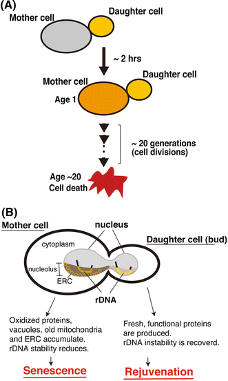 Asymmetrical cell division in budding yeast. a Life cycle of budding yeast. Budding yeast divides asymmetrically. The mother (bigger) cell ages with each cell division, leading to senescence after ~20 cell cycles. However, the daughter cell (smaller) rejuvenates and maintains the capability for division. b rDNA is unstable in the mother. Defective cellular constituents such as oxidized proteins, vacuoles, episomes, and old mitochondria stay and accumulate in the mother cell. Stable rDNA segregates to the daughter cell while unstable rDNA remains in the mother