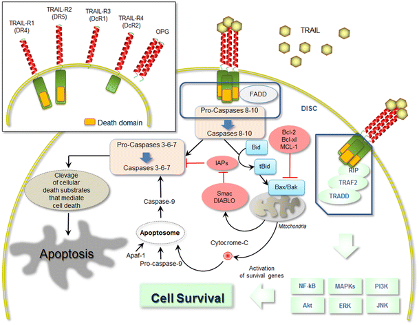 As previously mentioned, the best characterized biological function of TRAIL is its ability to induce apoptosis in various cancer cells types [49, 50, 51]. This is mediated by its two death-domain-containing receptors, whereas TRAIL-DcR1, TRAIL-DcR2 and OPG are considered neutralizing or regulatory receptors [52]. Signals resulting from death-domain–ligand interaction can induce apoptosis via assembly of the death-inducing signalling complex (DISC) [53]. This is formed by the Fas-associated death domain (FADD), which promotes autocatalytic processing of caspases, activation of caspases, and thereby apoptosis [53].