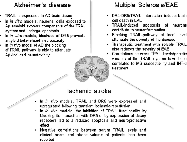 Snapshot of the main preclinical evidences of the involvement of TRAIL in neuroinflammatory diseases. The picture shows some of the most interesting features coming from the preclinical models/evaluations about the role of TRAIL in the context of Alzheimer’s disease, multiple sclerosis and ischemic stroke in view of a future clinical development of TRAIL-based therapeutic strategies