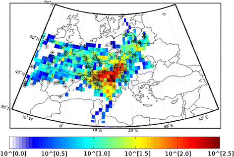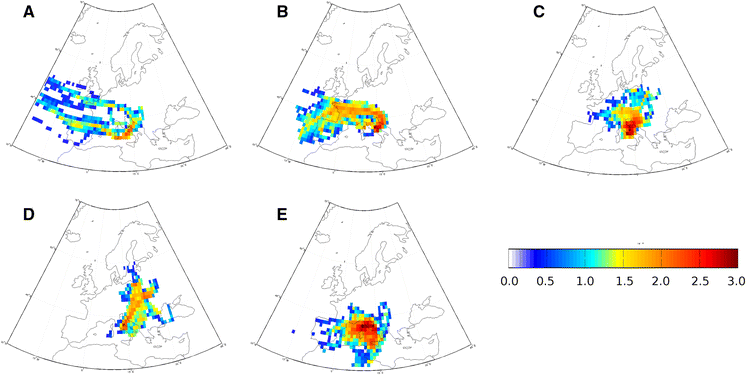 Field concentrations of back-trajectory points for the five air-mass clusters: Atlantic Ocean (a), western Europe (b), continental Europe (c), eastern Europe (d), Mediterranean basin (e). The coloured bar denotes the number of back-trajectory points on a logarithmic scale