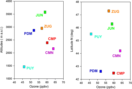Summertime mean O3 values at CMP during the experimental campaign in comparison with the climatological values (period 2001–2008) reported by Gheusi et al. (2011) for five European mountain stations: Jungfraujoch (JFJ), Zugspitze (ZUG), Pic du Midi (PDM), Monte Cimone (CMN), Puy de Dôme (PUY). On the left (right): the y-axis reports the altitudes (latitudes) of the measurement sites