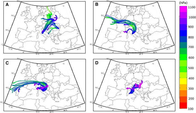 - On 8 August 2009, daily O3 values of 65 ppb were recorded at CMP. Back-trajectory analyses showed the measurement site was affected by air masses which originated over central and eastern Europe. In particular, during their transport toward central Italy and CMP (Fig. 6a), these air masses travelled at relatively low altitudes (at pressures greater than 800 hPa) over Romania, Bulgaria, and the Czech Republic. As reported by the European Environment Agency (EEA 2010), on 1–3 August 2009, exceedances of the O3 information threshold (180 μg m−3 or 90 ppb) were recorded in these countries. Thus, despite a possible contribution related to the transport of polluted air masses from the regional ABL by local “thermal” winds, the possibility that the high O3 values at CMP might be because of photochemical O3 production over west and central Europe cannot be ruled out.Fig. 6