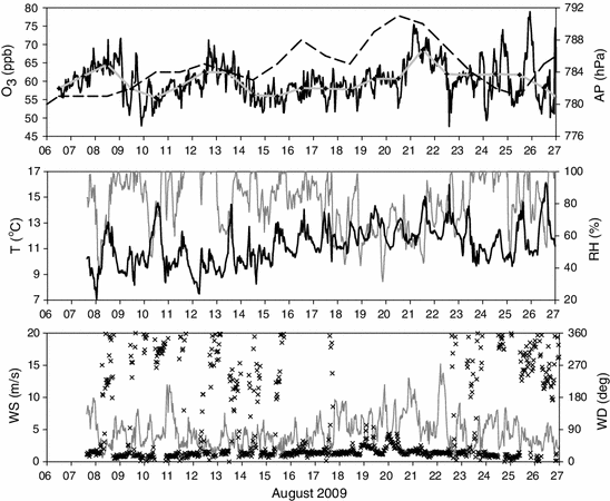 Upper plate time series of 30-min and daily average O3 values (black and grey continuous lines), and daily average atmospheric pressure (AP). Middle plate time series of air-temperature (black line, T) and relative humidity (grey line, RH). Bottom plate time series of wind speed (grey line, WS) and wind direction (crosses, WD)