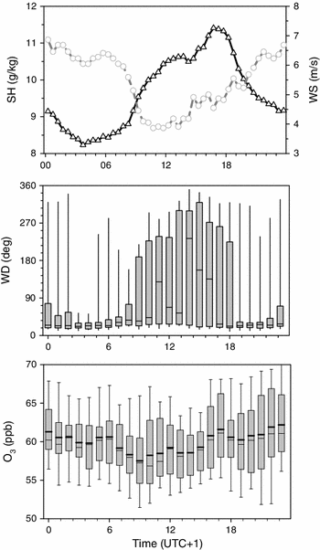 Diurnal variations of specific humidity (black line, SH) and wind speed (gray line, WS) average hourly values (upper plate), local wind direction (middle plate) and surface O3 (bottom plate). For WD and O3 the box-and-whisker plots denote the 10th, 25th, 50th, 75th, and 90th percentiles of the hourly distributions. In the bottom plate, the bold line denotes mean hourly O3 values