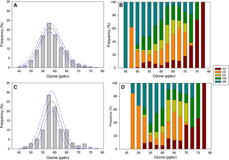 Figure 8a also reports the calculated fit with the interval (dashed lines) for the 95 % confidence level. For each O3 value bin, we calculated the percentage of the air-mass cluster occurrence (Fig. 8b). As deduced by this analysis, the contribution of MB air-masses is maximized for O3 concentrations ranging from the lowest values to the distribution peak, whereas it decreased for O3 higher than 60 ppbv. On the other hand, the occurrence of CE and EE air-masses increased with increasing O3 values. In particular, the CE cluster is the atmospheric circulation prevailing (with 40 % of occurrence) for O3 values between 65 and 70 ppbv. As shown in Fig. 8b, a generally low occurrence of AO circulation was observed for the different O3 values. Only the upper O3 values observed at CMP were mostly associated with air-masses related with WE and AO circulations, suggesting that O3-enriched air masses from the free troposphere could significantly contribute to the episodic occurrence of these high O3 concentrations at the measurement site.