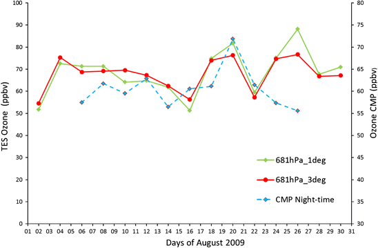 Daily TES ozone mixing ratio over the CMP region for the 681 hPa layer and for different spatial aggregations (1 × 1° and 3 × 3°: green and red lines, respectively). For comparison, CMP daily O3 values obtained by averaging the hourly values for nighttime (from 0:00 to 5:00 UTC+1) are reported (blue line)