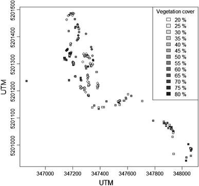 Distribution of 106 diploid (circles) and 104 hexaploid (squares) individuals of Senecio carniolicus on Mt Hoher Sadnig, mountain range of Goldberggruppe, Carinthia, Austria. Gray shading represents the total cover of vascular plants within a radius of 20 cm around each individual