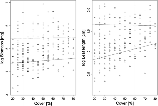 Effects of vegetation cover on biomass and leaf length of diploid (triangles/solid lines) and hexaploid (crosses/dashed lines) individuals of Senecio carniolicus