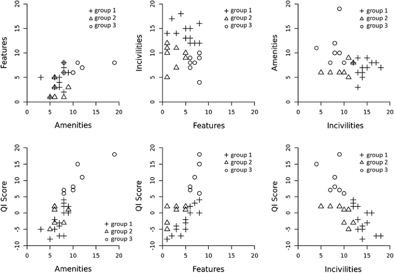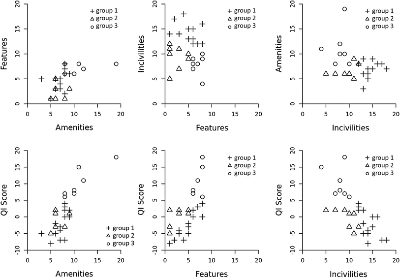 Distribution of praças according to the cluster, features, amenities, incivilities, and quality indicator (Cidade de Deus, Rio de Janeiro, Brazil, April–July, 2012)