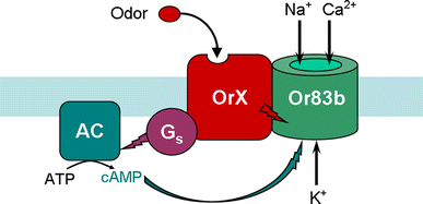 Scheme of odorant signal transduction. The insect odorant receptor complex is composed of an odorant-specific receptor protein OrX and the non-selective cation channel Or83 that conducts Na+, K+ and Ca2+. Odor-stimulation of OrX activates Or83 by an ionotropic and a metabotropic pathway. The direct activation of Or83b by OrX (red flash) leads to a fast and transient cation flow. The metabotropic pathway stimulates—via activation of Gs proteins by OrX—the adenylyl cyclase (AC) activity (violet flash) and thus the cAMP production. cAMP in turn activates Or83b (blue-green flash). The ionotropic pathway ensures a very rapid recognition of high odor concentrations while the metabotropic pathway allows highly sensitive odor detection