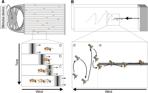 Steck-Knaden assay. A 16 individually tracked flies are exposed to a clean-air flow. a–c A computer-controlled stimulus device generates odor stimuli, that meet the flies at a predictable time. When encountering an attractive odor, flies walk upwind. The tracking system calculates upwind speed before and after the stimulus reaches the fly. B Wind tunnel. d Flies show crosswind flights when exposed to clean-air flow. e When getting in contact with an odor plume, flies start upwind flights. A 3-D tracking system detects the time of plume contact and plume loss and calculates the flight’s directionality and upwind speed before and afterwards