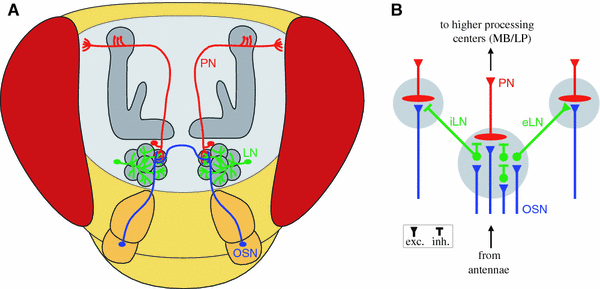 Schematic of the Drosophila olfactory pathway. a Antennal olfactory sensory neurons (OSN, blue) converge in specific glomeruli of the antennal lobe. Some of them send an axonal branch through the antennal commissure to the other hemisphere. Local interneurons (LN, green) branch in all glomeruli and interconnect these with each other. Projections neurons (PN, red) collect the olfactory information within the antennal lobe and send their axons to higher processing centers as the calyx and the lateral protocerebrum. b Circuit diagram of the antennal lobe. The three principal populations of neurons and their synaptic connections within the glomeruli (gray circles) are represented. The diagram summarizes anatomical data from several insect species. Excitatory synapses are symbolised by triangles, inhibitory synapses by bars. In Drosophila, the existence of both inhibitory local interneurons (iLN) as well as excitatory local interneurons (eLN) has been shown