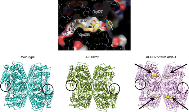 Alda-1, an allosteric agonist of ALDH2, corrects the structural defect in the ALDH2*2 mutant present in 8 % of the human population (from Chen et al. [1] with permission). Upper panel shows a stick presentation with the structure of Alda-1 in the catalytic tunnel. The critical amino acids are highlighted. Lower panel shows crystal structure of wild-type ALDH2 and mutant ALDH2*2. ALDH2*2 is restored when bound with Alda-1