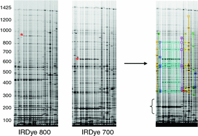 Polymorphism discovery in Musa by Ecotilling. IRDye 800 and IRDye 700 images shown for 20 lanes of a 96 lane assay screening for polymorphisms in the 1,495 bp STARCHST gene target. Data is analysed using the GelBuddy program (Zerr and Henikoff 2005). True nucleotide polymorphisms produce cleaved fragments in each fluorescent channel whose molecular weights sum to the approximate molecular weight of the uncut PCR product (an example is marked with a red asterisk). Molecular weights are provided by the GelBuddy program. Samples with similar banding patterns are recorded as having the same haplotype pattern (right panel samples with the same banding pattern are visually grouped by color, numerical data table not shown). Band selection was performed manually. Putative polymorphisms in gel regions with high levels of noise from primer mispriming (denoted by bracket), and the corresponding fragments in the alternative image channels could not be unambiguously assigned and therefore were not scored