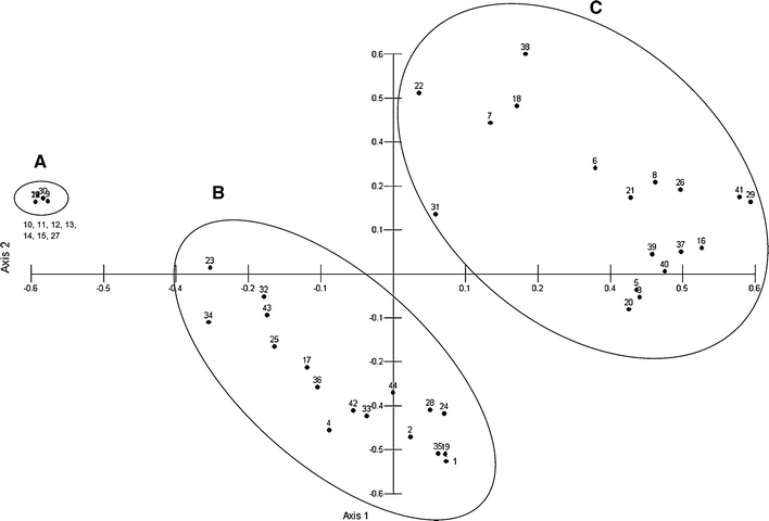 Principal component analysis of 44 Musa accessions using SNP position data from 7 gene targets. Three clusters are resolved with ‘Grande Naine’ and related triploid AAA accessions found in cluster a, hybrid accessions of mixed AB chromosomes chromosome type found in cluster c, and accessions of either A or B chromosome type found in cluster b. One sample of mixed chromosome type (Yawa 2, ABBT, sample number 44) was found in cluster b (1/44, 2%). Sample identity listed in Supplementary file 1, PCA table in Supplementary file 4