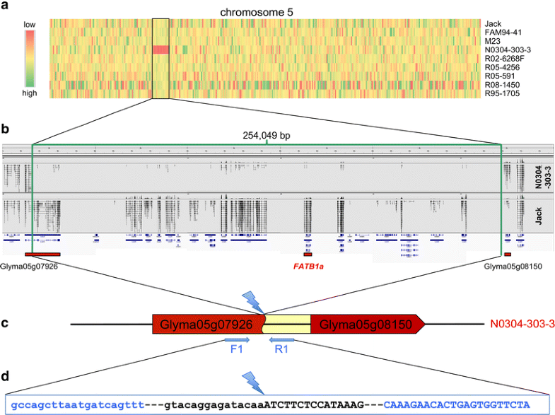 Identification of a 254-kb deletion on chromosome 5 in N0304-303-3. a This heat map represents expression variation among nine soybean genotypes. The Z score values of all genes arranged by chromosome location were displayed using a color gradient. Please note the red cluster of adjacent genes in N0304-303-3 that appear to be expressed at a significantly lower rate. These genes are listed in Table 2. b An IGV view of the region on chromosome 5, which contains the N0304-303-3 deletion, shows RNA sequence read alignments of soybean genotypes N0304-303-3 and Jack, and corresponding gene models. The deletion breakpoints, which are indicated by green bars, were determined by PCR analysis and sequencing of the amplification product (see below). The deletion in N0304-303-3 is 254,049 bp in size and includes 19 gene models. The FATB1a gene, and the genes located in or next to the breakpoints are marked by red bars. c The deletion in N0304-303-3 generated a fusion gene that consists of the 5′ end of Glyma05g07926 (in red), a small intergenic sequence (in yellow) and Glyma05g08150 (in red). The blue arrows represent both PCR primers used for the amplification across the deletion site (not drawn to scale). d The partial sequence of the PCR product spanning the deletion junction is presented. The primer binding sites are depicted in blue. The 5′ region flanking the deletion site is shown in lower-case letters, while the 3′ region is in upper-case letters (color figure online)