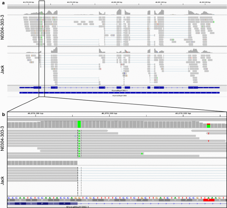 IGV view of the KASIIIA gene encoding a 3-ketoacyl ACP synthase. a RNA-seq reads for N0304-303-3 and Jack aligning to the KASIIIA gene model are shown. Please note that RNA-seq reads align to the first intron of N0304-303-3 while no reads can be detected in the intron for Jack. b A zoomed-in view of the first exon–intron junction reveals a single nucleotide change from G to A at the 5′ splice consensus sequence in N0304-303-3. The SNP may have prevented the splicing of intron 1 in N0304-303-3. Retention of the first intron results in a reading frame shift subsequently leading to a premature stop codon (shown in red) (color figure online)