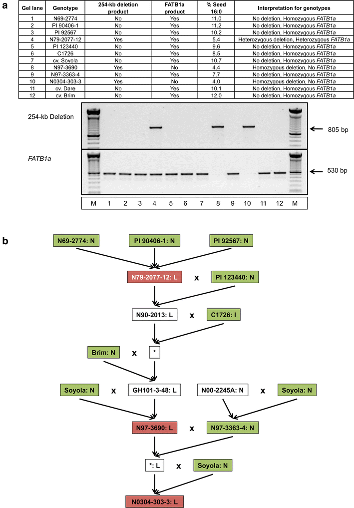 Origin of the large deletion discovered in N0304-303-3. a Extant soybean genotypes associated with the development of N0304-303-3 were screened by PCR for presence of the large deletion and the FATB1a gene. If the 254-kb deletion is present in one or both (diploid) chromosomes 5, then an 805 bp product will be amplified. If the FATB1a gene is present, either in haploid or diploid condition, then a 530 bp product will be amplified. The presence/absence of the deletion and FATB1a in homozygous or heterozygous condition was deduced from both PCR results (see summary table). b A pedigree of genotypes involved in the development of N0304-303-3 is presented together with their deletion genotype (see a) and their palmitic acid content. Genotypes in a red box contain the deletion, while genotypes in a green box lack the deletion. A white font in a red box indicates a genotype with a homozygous deletion, whereas a black font in a red box represents genotypes with a heterozygous deletion. The palmitic acid content is given after the genotype name as normal (N), intermediate (I), or a low (L) (color figure online)