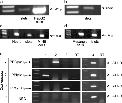 Angiotensinogen, angiotensin-converting enzyme and AT1 receptor mRNA expression. Standard RT-PCR was performed for human angiotensinogen (a), human angiotensin-converting enzyme (b), rodent AT1 receptor (c) and human AT1 receptor (d) using RNA extracted from human islets (a, b, d), HepG2 human liver cells (a), mouse heart, mouse islets and MIN6 cells (c) and from human kidney mesangial cells (d). e PCR amplifications from single dispersed human islet alpha, beta or delta cells or from non-endocrine cells (NEC). The islet endocrine cells were identified by reactions using primers for preproinsulin (PPI, lane 1), preproglucagon (PPG, lane 2) and preprosomatostatin (PPS, lane 3). Cells that did not express PPG, PPI or PPS were designated NECS (row 4). Lane 4 shows AT1 receptor (AT1-R) mRNA expression. -RT indicates the absence of product formation when using an mRNA template in the absence of reverse transcriptase