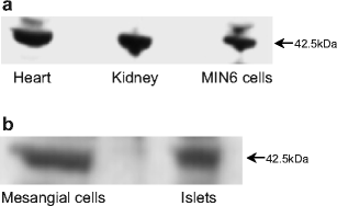 AT1 receptor protein expression. Western blotting was performed on fractionated samples of mouse heart, kidney and MIN6 cells (a) and human kidney mesangial cells and human islets (b) using a polyclonal antibody directed against the AT1 receptor and a horseradish-peroxidase-labelled secondary antibody