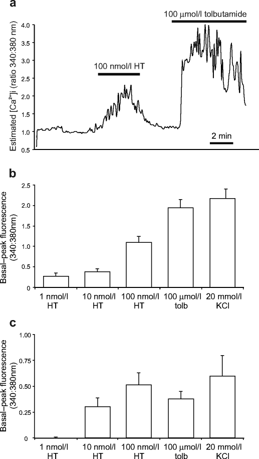 Changes in intracellular calcium in Fura-2-loaded beta cells. a Trace from a single Fura-2-loaded MIN6 cell. Mean+SEM basal-peak fluorescence data for b MIN6 cells (n=16) and c human islet beta cells (n=6)