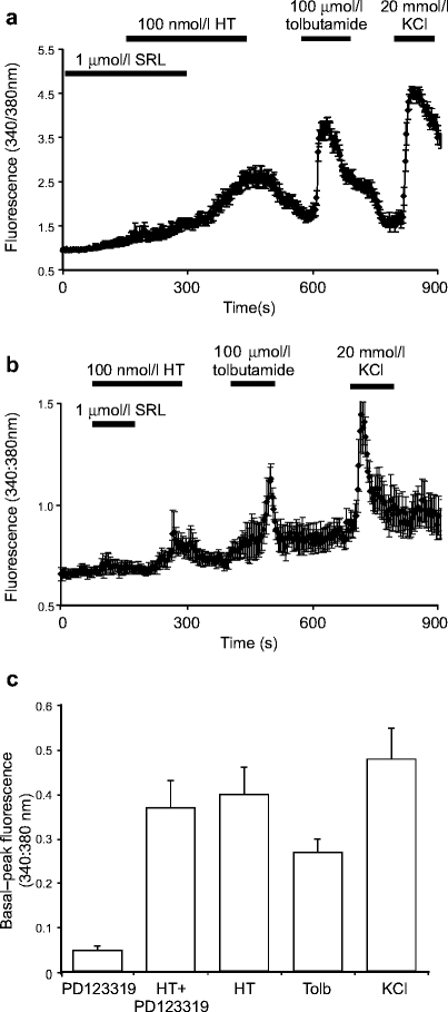 Effect of AT receptor antagonists on intracellular calcium. Mean±SEM fluorescence traces from Fura-2-loaded MIN6 cells (n=16) (a) and from b human islet beta cells (n=4) showing the effects of hypertensin (HT) in the presence of saralasin (SRL). c Mean basal–peak fluorescence data (+SEM, n=17–22) of the effects of PD123319 in human islet beta cells
