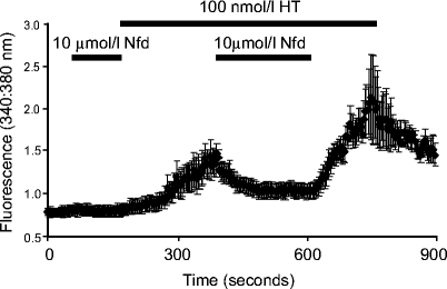 Effect of nifedipine (Nfd) on intracellular calcium. Mean±SEM fluorescence traces from Fura-2-loaded MIN6 cells showing the effects of Nfd on hypertensin-stimulated increases in calcium (n=4)