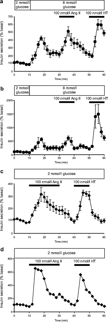 Insulin secretion from perifused human islets and MIN6 cell clusters. Isolated human islets (a, c) and MIN6 cell clusters (b, d) were perifused with media supplemented with the agents shown by the horizontal bars (Ang II angiotensin II; HT hypertensin) and insulin secretion was measured every 2 min by RIA. Data are from two to four separate perifusion chambers of islets from a single isolation and are expressed a–c as means±SEM (n=4) and d as means (n=2)