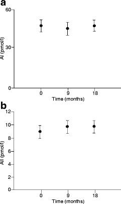 Plasma AI (a) and AII (b) levels during 18 months of chronic lisinopril therapy (20 mg/day) in 30 type 2 diabetic patients. No significant changes occurred