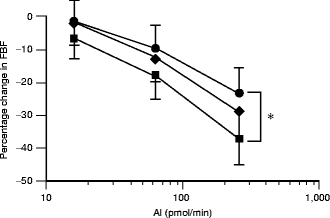 FBF responses to AI infusion at baseline (black circles), 9 (black diamonds) and 18 (black squares) months. *p = 0.01