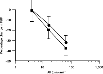 We used differential intrabrachial artery infusion of AI and AII to measure vascular tissue conversion of AI into AII. This is a well-established technique based on the premise that AI only produces vasoconstriction when converted into AII in vascular tissue [9]. There are two reasons why this technique is thought to mainly reflect AI to AII conversion in vascular tissue, rather than within the circulation [11]. The first reason is that AI to AII conversion in blood is much slower than the transit time in the circulation. The second reason is that the offset of the effect of intra-arterial enalaprilat on AI responses is prolonged with a half-life that is 16 times longer than the transit time in the forearm circulation and hence 16 times longer than the time enalaprilat will be present in the blood locally.
