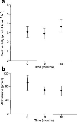 Plasma renin activity (a) and aldosterone (b) levels during 18 months of chronic lisinopril therapy (20 mg/day) in 30 type 2 diabetic patients. No significant changes occurred