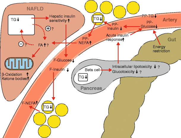 Lim et al. tested the hypothesis that a sudden, remarkable negative energy balance is a signal that induces a series of metabolic events beyond those expected for the amount of weight lost [6]. Eleven obese patients with type 2 diabetes (BMI 33.6 kg/m2, HbA1c 7.4% [57 mmol/mol]) were studied before and after 1, 4 and 8 weeks of a 2.5 MJ (600 kcal)/day liquid formula diet (46% carbohydrate, 33% protein, 20% fat; around 70 g of carbohydrate per day). The patients had been diabetic for less than 4 years and were treated with oral antihyperglycaemic agents other than glitazones. Hepatic and peripheral insulin sensitivity and beta cell function were assessed using state-of-the-art methods. The triacylglycerol content of the pancreas and liver were measured using proton magnetic resonance spectroscopy imaging (1H-MRS). Eight age-, sex- and weight-matched non-diabetic individuals were studied as a control group. At the end of 8 weeks, the patients had lost 15 kg (15%) of their body weight. Their fasting glucose and HbA1c levels became normal and their plasma triacylglycerol levels halved. Liver fat content decreased by 70%, from 12.6% to 2.9%. Or, put another way, non-alcoholic fatty liver disease disappeared (normal liver fat is <5.6% using 1H-MRS). Hepatic insulin sensitivity improved, while muscle insulin sensitivity did not change. After only 1 week, liver fat had decreased by 30%, fasting glucose had been normalised and the fasting insulin secretion rate had significantly decreased. Throughout the study the acute insulin response to glucose increased in a continuous manner and was similar to that in the non-diabetic volunteers at 8 weeks. Pancreatic fat content showed an inverse pattern and gradually decreased to normal.