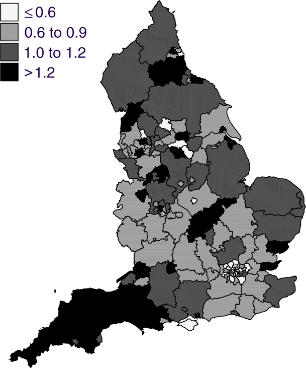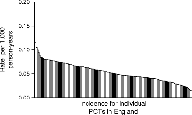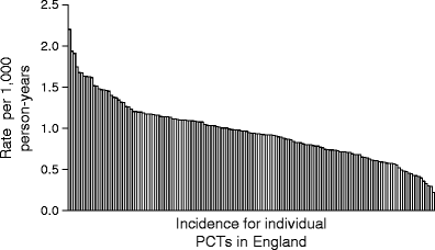 Variation in access to effective healthcare may be one factor underlying the 8.6-fold variation in incidence of major amputation (an amputation performed above the ankle) observed between 306 healthcare regions in the USA [5]. Such variation in access should not apply to any great extent, however, in countries such as England that have a nationalised health service free to all at the point of delivery. Despite this, a fourfold variation in the incidence of total amputations (major plus minor) was observed between four localities in mid- to northern England in the 1990s [6]. More recently, the UK Atlas of Variation in Health Care has reported a twofold variation in the incidence of major amputation in type 2 diabetes between ten Strategic Health Authorities in England [7]. Such variation might reflect important differences in the structure of lower limb healthcare delivery. In order to explore the extent of this variation in more detail, we have examined the records of hospitals in England and have compared the incidence of amputations between the 151 Primary Care Trusts (PCTs) in England. PCTs are local health economies covering populations of 100,000 to 500,000 individuals, comprising all the patients registered with a geographically coherent group of general practitioners.