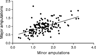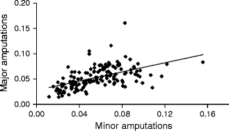 Correlation between the incidences of major and minor amputations in people with diabetes between PCTs in England 2007–2010. R = 0.537, p = 0.0005