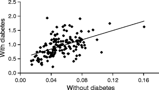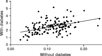 Correlation between the incidences of major amputations in people with and without diabetes between PCTs in England 2007–2010. R = 0.528, p = 0.0005