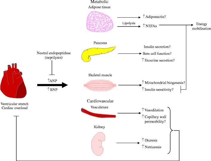 It has been known for 50 years that heart failure patients suffer from chronically elevated catecholamines [1], which alter glucose metabolism by depressing insulin secretion and increasing glycogenolysis and gluconeogenesis, thus resulting in hyperglycaemia [2]. Perhaps it is not entirely surprising, then, that B-type natriuretic peptide (BNP) and A-type natriuretic peptide (ANP), which are produced in response to cardiac stress and mechanical stretch of the myocardium and are physiological antagonists of the renin–angiotensin system, might also play a role in energy metabolism. The potential role for these peptides in metabolic pathways has already been the subject of intense interest, as both BNP and ANP are known to be potent stimulators of lipolysis in adipose tissue [3, 4].