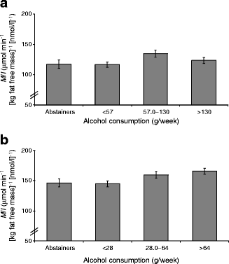 Insulin sensitivity, expressed as the M/I value according to categories of alcohol consumption (in g/week) in men (a) and women (b). Data are means ± SEM. p trend = 0.07 for men and p trend = 0.005 for women, adjusted for age, recruitment centre, physical activity, smoking and waist circumference after a logarithmic transformation for M/I