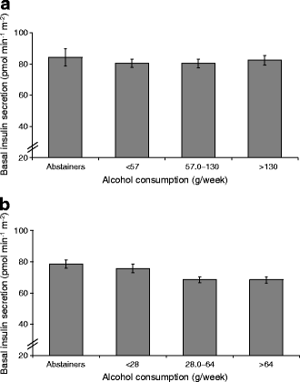 Basal insulin secretion across alcohol consumption categories in men (a) and women (b). Data are means ± SEM. p trend = 0.56 for men and p trend = 0.004 for women, adjusted for age, recruitment centre, physical activity, smoking and waist circumference after a logarithmic transformation for insulin secretion