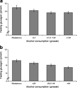Fasting glucagon concentration according to categories of alcohol consumption (in g/week) in men (a) and women (b). Data are means ± SEM. p trend = 0.37 for men and p trend = 0.01 for women, adjusted for age, recruitment centre, physical activity, smoking and waist circumference after a logarithmic transformation for glucagon