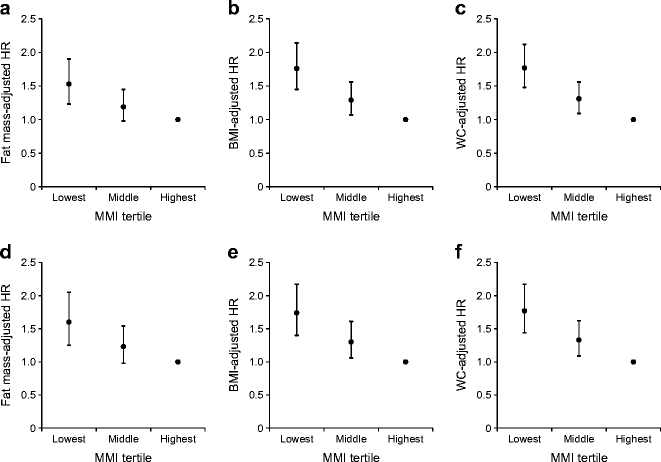 Adjusted HRs for incident type 2 diabetes according to sex-specific tertiles of MMI. Adjustment variables for multivariable-adjusted HRs included main covariates, body fat or obesity as categorical variables. HRs (95% CI) adjusted by (a) fat mass, (b) BMI and (c) waist circumference (WC) across tertiles of MMI in all participants. (d–f) The same analyses excluding participants diagnosed with diabetes within the first 2 years of follow-up